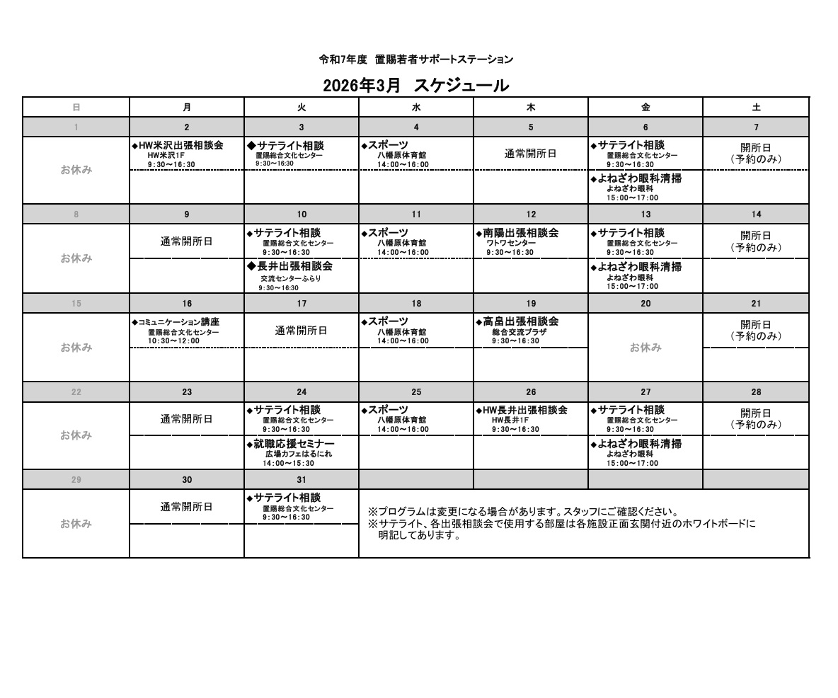 Home お知らせ, ブログ 3月のスケジュールです! 3月のスケジュールです! 2026.02.27 お知らせ、ブログ 3月のスケジュールです。ご確認ください。 Post Share Hatena Pocket RSS feedly Pin it コメントは利用できません。